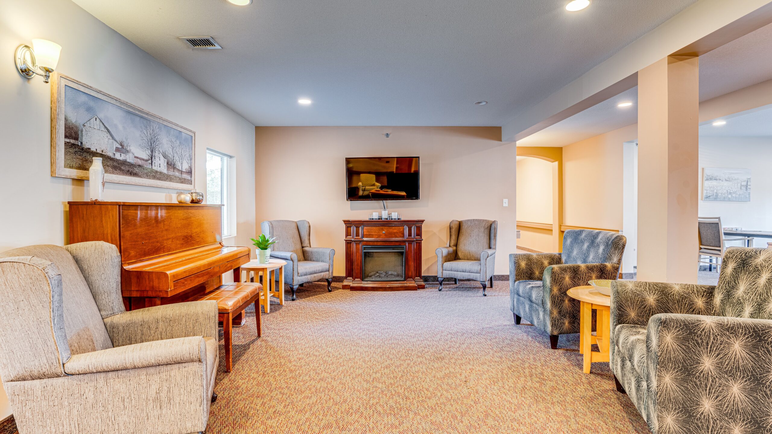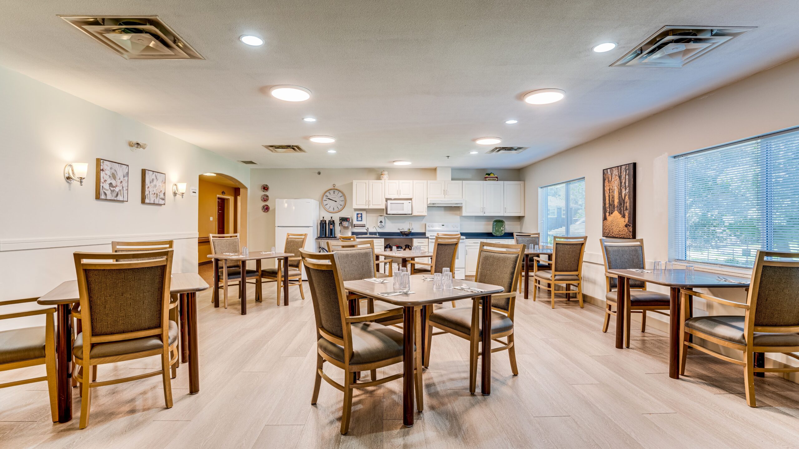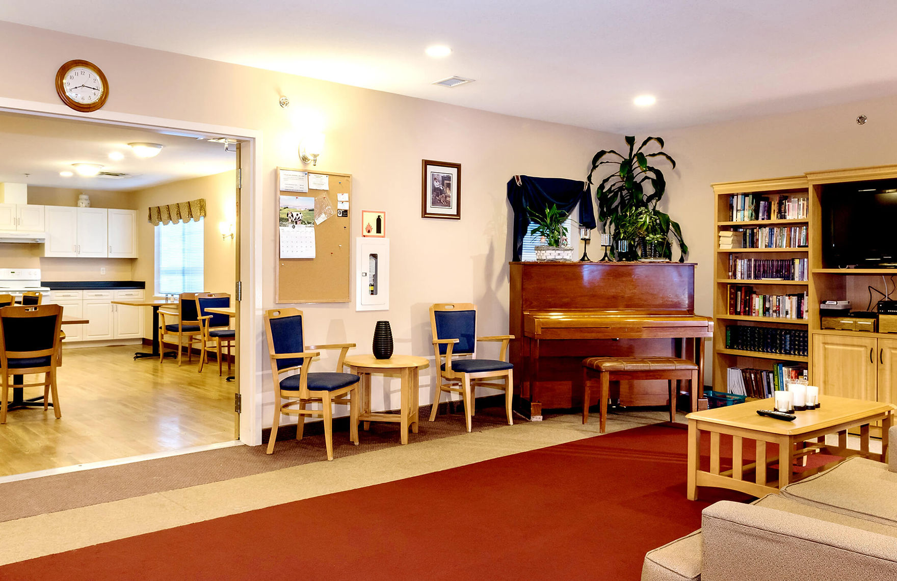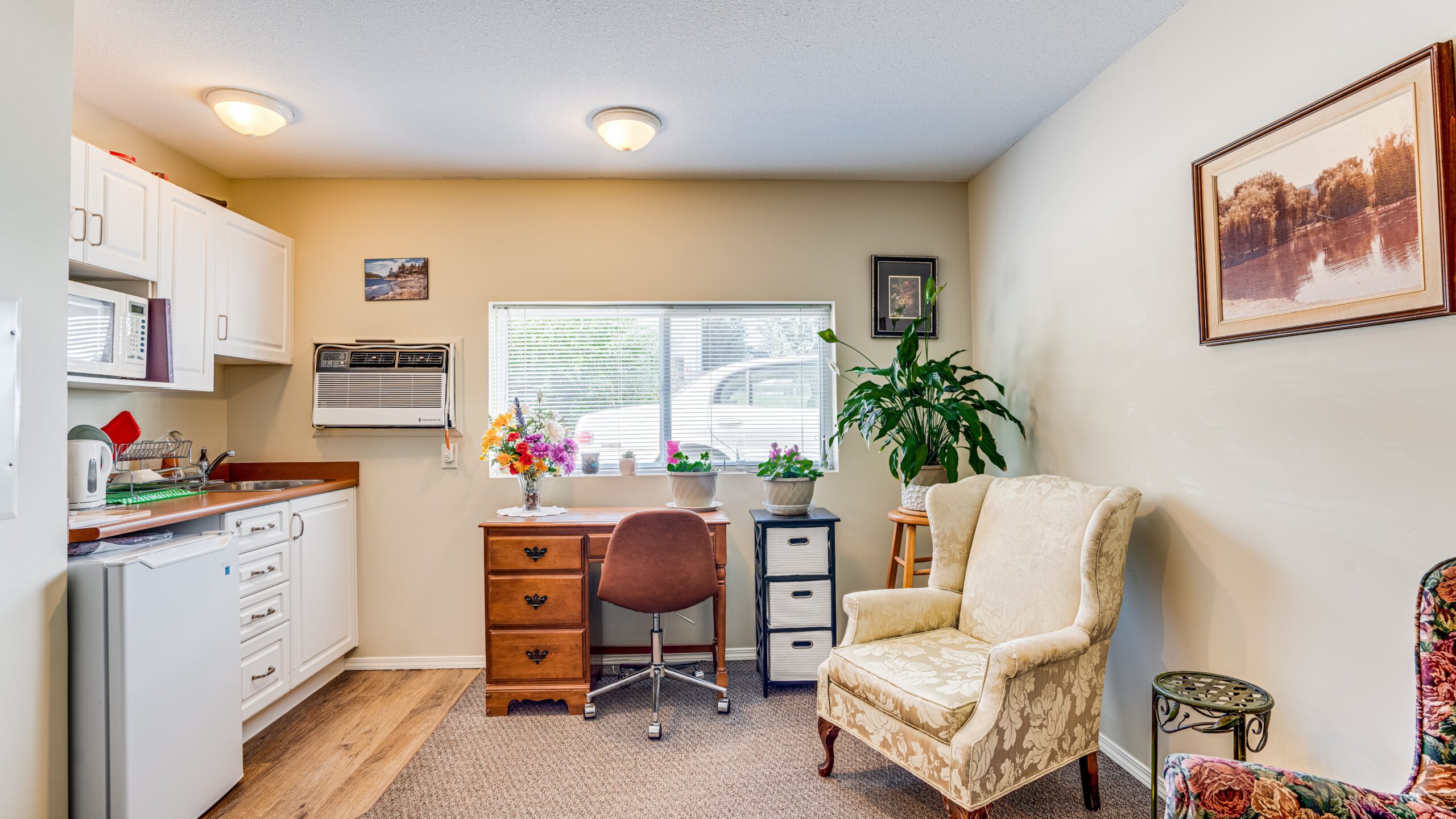 The spacious suites are perfect for seniors who can care for themselves, but need help with activities of daily living tasks like cooking, cleaning, medication and laundry. Our friendly staff provides just the right amount of support each resident needs. Each suite includes an open living area, a kitchenette with a small fridge, microwave, and sink, a separate bedroom, and a large, fully accessible bathroom.